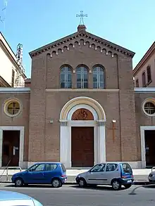The neo-Romanesque structure was built to the designs of Costatino Schneider, prompted by the concerns of Pope Pius X for the development of this sector of the city and thanks to his legacy, not long after his death in August 1914, construction was completed in 1916. Its brick facade fits closely between the parish school and offices on either side. It combines a variety of medieval elements. A terracotta bas-relief of the Madonna sits in a lunette above the centered doorway. Above are three windows crowned by a pitched roof in the style known as copertura a capanna with many decorative projections. Two doors corresponding to the interior side aisles flank the center portion of the facade, the narrow and low shapes serving to emphasize the form of the facade. The interior of the church was expanded and much altered in 1954–55 according to designs by Paolo Stefani.[3]