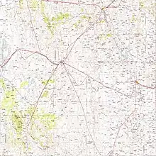 At the turn of the twentieth century, Santa Rosa was not the largest settlement within the region. Puerto de Luna, approximately ten miles south, held the county seat for Guadalupe County. Santa Rosa was smaller than Puerto de Luna until 1901 when the Chicago, Rock Island & Pacific Railroad was built into Santa Rosa from the east, quickly followed by arrival of the El Paso and Northeastern Railway in February 1902, from the southwest, thereby creating a transcontinental connection.[5] As the terminus and interchange point of the two railroads, a thriving community quickly developed (The interchange was moved to Tucumcari after 1907). The county seat was moved to Santa Rosa from PDL in 1903.