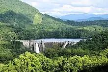 The Santeetlah Dam forms the Santeetlah Reservoir, which covers approximately 2,881 acres (1,166 ha), normal full pool area, with a drainage area of 176 square miles (460 km2) and stretches to Robbinsville, North Carolina. The elevation of Santeetlah Reservoir is 1,940.9 feet (591.6 m) according to the USGS. The dam is 212 feet (65 m) high and 1,054 feet (321 m) long, and was one of the first structures built using vibratory damping to control concrete quality. It has two spillways with a capacity of 50,000 cfs. It is topped by concrete gatehouse which controls water flows into the five mile tunnel running to the Little Tennessee.[2] The project's major elements were listed on the National Register of Historic Places in 2004.