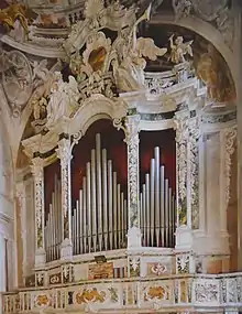 All the ceilings of the hall, both the central and side vaults, are completely frescoed with the illusionistic architecture of Tommaso Sandrino,[78] complemented by scenes by other authors. The extensive fresco on the nave consists of a continuous balustrade, supported by corbels, on which rest mighty Solomonic columns supporting a false ceiling, ideally higher and deeper than the real one. The basic balustrade is not linear, but follows a continuous ascent and descent of faux staircases that bypass the open lunette windows at the base of the vault. Finally, the whole is largely embellished with various decorations and architectural motifs. The work of Antonio Gandino and his son Bernardino is the large central panel, depicting the Glory of the martyred saints Faustinus and Jovita. The fresco depicts the two saints as they ascend to heaven in the presence of the Trinity amid a riot of musician angels. The two ascending saints wear transparent, fluttering white robes and wear stoles in the manner of the priestly Faustinus and the diaconal Jovita, so as to make specific the identity of each according to the data of tradition.[78]