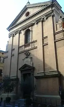 In 1676, it passed to the order of Clerics Regular ministering to the sick (Chierici Regolari Ministri degli Infermi). The earthquake of 1780 damaged the church, and it was rebuilt by the architect Angelo Venturoli. Over the entry is the heraldic shield of the Ghisilieri family, and the bell-tower was adapted from a medieval tower from a family palace.