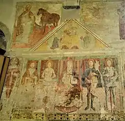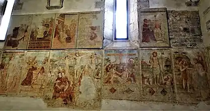On the southern wall next to the Saint Sebastian altar, there are a series of paintings depicting the history of the Passion. The conservation status of these frescoes is precarious, due to the conditions of the masonry and the minimum thickness of the plaster. The six upper paintings were torn in 1963 due to moisture damage. Five of the paintings were restored and reallocated to their original positions. The sixth one is not longer visible. The lower septa paintings are less spotty than the upper ones but have colour drops, damp patch and traces of retouching.[3]