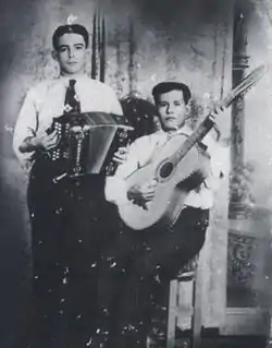 Almeida was born in Skidmore, Texas, and grew up on a farm.[1] In his teens played the bajo sexto in his family's ensemble, La Orquestra Almeida.[2][3] In the mid-1930s, Almeida began playing with accordionist Narciso Martínez at local dances and festivals around Brownsville, Texas, and Raymondville, Texas. Local merchant and furniture store owner Enrique Valentin heard them and persuaded recording director Eli Oberstein to record them for the Bluebird label.[4] In 1935, Almeida and Martinez recorded a single for Bluebird Records, "La Chicharronera" b/w "El Troconal" (the former a polka and the latter a schottische).[5] These are generally regarded as the earliest known recordings of conjunto music. The duo would record extensively for Bluebird, releasing some 60 additional singles for the label between 1935 and 1938. The pair's popularity grew as a result, and they performed extensively, both live in South Texas and on record as backing musicians for conjunto singers. In the 1940s, the pair continued to record for Ideal Records and Disco de Oro.