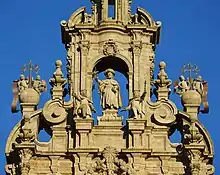 At the top of the façade is an 18th-century statue of St. James, with two kings in prayer at his feet: Alfonso III of Asturias and Ordoño II of León. In the centre is the statue of Faith.[17][18]