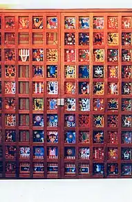 Pensamiento y alma Huichol was created in 1997 Palais Royal-Musée du Louvre station as part of the RATP Group - Mexico City Metro alliance. This is his most renowned and talked about work, which represents Huichol deities, ancestors, myths, flora and fauna on a horizontal tripctic of the underground, the earth and the sky. The work is composed by 80 boards and elaborated with two million beads of 2 millimeters each one. It is located at the Palais-Royal Musée du Louvre towards the Carrousel du Louvre. On this work, researcher Miguel Gleason comments on his book México insólito en Europa: “Its perhaps the most impressive and detailed work in Europe, composed by more of 2 million beads that shows the cosmogony of that community (Huichol people)".[3]