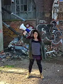 Sara Shaarawi stands in a derelict biscuit factory in Glasgow holding a Megaphone in a promotional image for the Workers Theatre.