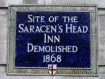 The Saracen's Head was demolished in 1868 to construct the Holborn Viaduct.[6] The landlord was subsequently arrested for attempting to sell spirits in an adjoining property following the inn's closure, as his licence had been revoked.[7] There is a plaque noting the inn on the current premises.[8]