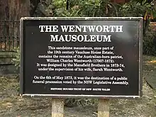 - 1 2 3 4 5 6 "Wentworth Mausoleum and site". New South Wales State Heritage Register. Department of Planning & Environment. H00622. Retrieved 2 June 2018.