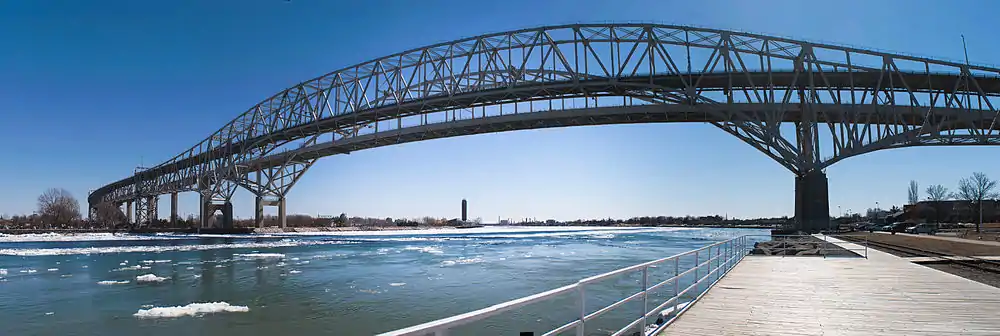 Together, the two bridges connect Chicago and the Midwestern United States with Toronto and the Northeastern United States, one of the four shortest routes of land travel between the US Midwest and Northeast. They are the second-busiest commercial crossing on the Canada–United States border, after the Ambassador Bridge at Detroit-Windsor,[4] and the fourth-busiest overall international crossing in Ontario in terms of total number of vehicles[5] at 4.7 million annually as of 2011.[6] In Canada, they are the third-busiest bridges after the Champlain Bridge in Montreal and the Ambassador Bridge.