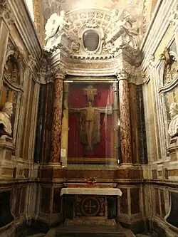 Sarzana Cathedral is known as the location of the oldest dated Tuscan crucifix, the Cross of Maestro Guglielmo, dated 1138, a central work of Romanesque painting, despite some re-touching of the face and body in the 14th century. The crucifix is a prime example of the iconography of the Christus triumphans type that preceded the establishment of the iconography of the Christus patiens, which represents a more human and suffering Jesus. The crucifix is now set up in the baroque Chapel of the Cross to the north of the choir and high altar.[5]