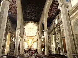 The apse contains a Glory of the Virgin, a Baroque scenography reminiscent of Bernini, beneath an elaborate cupola. The 17th-century sculptures in the Chapel of Saint Augustine are by the Carrarese Giovanni Antonio Cybei.
