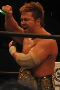 On July 3, Kojima teamed up with Matt Sydal and Ricochet to defeat The Elite (Kenny Omega and The Young Bucks (Matt Jackson and Nick Jackson)) for the NEVER Openweight 6-Man Tag Team Championship.[76] Afterwards, Kojima backed out of the 2016 G1 Climax and gave his spot to Hiroyoshi Tenzan to give his longtime tag team partner one final chance to win the tournament.[77] On August 14, Kojima unsuccessfully challenged Jay Lethal for the Ring of Honor (ROH) World Championship.[78] On September 25, Kojima, Ricochet and Sydal were stripped of the NEVER Openweight 6-Man Tag Team Championship due to Sydal failing to make a scheduled title defense at Destruction in Kobe because of travel issues.[79] That same day, Kojima and Ricochet, now teaming with David Finlay, defeated Adam Cole and The Young Bucks to regain the vacant title.[80] They lost the title to Los Ingobernables de Japón (Bushi, Evil and Sanada) in a four-team gauntlet match at Wrestle Kingdom 11 in Tokyo Dome on January 4, 2017.[81] On March 6, Tencozy defeated Tomohiro Ishii and Toru Yano to win the IWGP Tag Team Championship for the sixth time.[82] They lost the title to War Machine (Hanson and Raymond Rowe) on April 9 at Sakura Genesis 2017.[83]