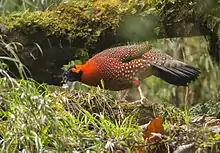 The satyr tragopan (Tragopan satyra) also known as the crimson horned pheasant, is a pheasant found in the Himalayan reaches of India, Tibet, Nepal and Bhutan. They reside in moist oak and rhododendron forests with dense undergrowth and bamboo clumps. They range from 2400 to 4200 meters in summer and 1800 meters in winter. The male is about 70 cm long.