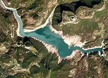 Sau Reservoir (Catalan: Pantà de Sau) is a reservoir located on the Ter river, near Vilanova de Sau, Catalonia, Spain. The dam was completed in 1962, creating a reservoir with a storage capacity of 151.3 hm³ that covered the former town of Sant Romà de Sau. The Church of Sant Romà is still visible when the water level is low. The dam has a structural height of 83 m and a crest length of 260 m.[1][2]