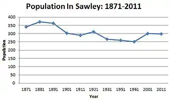 Census data of Sawley dates back to 1871, with the earliest total population figure being 341.[11] The population has been relatively constant with the highest population record being in 1881 with 372 and the lowest available data being in 1961 with 251. According to the 2011 census, Sawley had a population of 299.[12] This is only one less than the 2001 census where the population was 300.