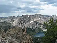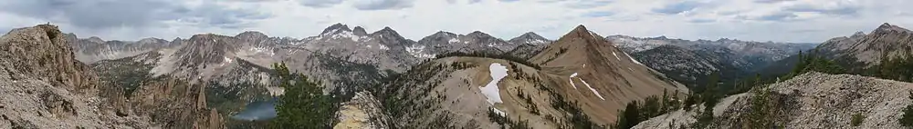 The northern Sawtooth Range formed from the Eocene Sawtooth batholith, while south of Alturas Lake the mountains formed from the Cretaceous granodiorite of the Idaho Batholith.[7][8] The Sawtooth Range has a history of alpine glaciation, but while no surface glaciers exist today, perennial snow fields and rock glaciers remain, usually on north or east facing slopes. There have been 202 perennial snow fields mapped in the Sawtooth Range.[9] The Sawtooth Range was last extensively glaciated in the Pleistocene, but glaciers probably existed during the Little Ice Age, which ended around 1850 AD.[10][11] Evidence of past glaciation given remnants of the glaciers such as glacial lakes, moraines, horns, hanging valleys, cirques, and arêtes.[10]