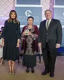 Mike Pompeo gives IWOC award to Sayragul Sauytbay (Melania Trump is to the left)