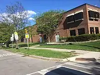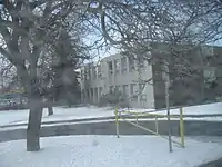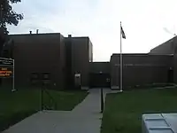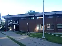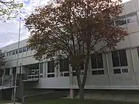 Until 1973, the board offices was also located at Scarborough Municipal Offices at 2100 Eglinton Avenue near Birchmount Road (built after World War II now demolished and site of parking lot). The new SBE administrative offices, located at 2466 Eglinton Avenue East (northside of Eglinton and west of Midland Avenue) and designed by architect Harold Carter, were built in 1954 and administrative operations were relocated in 1973. The former building was declared redundant by 1986 and was replaced by Rainbow Village condos in 1990.[32]