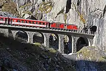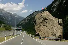 The Devil's Stone (Teufelsstein) is a large block of granite near Göschenen, with a height of c. 12 m and a mass of c. 2200 tons. In 1887, it was sold to the Maestrani Schweizer Schokoladenfabrik for 80 francs. Painted yellow, it now served as an advertisement for chocolate. In 1923, there were plans to demolish it, but it was preserved on the initiative of Max Oechslin, president of Naturforschende Gesellschaft Uri. In 1970, the Devil's Stone was again scheduled for destruction, to make way for the N2 motorway. This time, there was a broad movement to preserve it, and in 1971, federal authorities agreed to move the stone, with projected costs of 250,000 francs (of which the canton of Uri was to contribute 7,000). This led to a popular campaign opposing the plan because the cost was seen as excessive. The liberal newspaper Gotthard-Post proposed to spend the money on the construction of a retirement home instead, collecting 1,000 signatures in support. The cantonal government now argued that there was no legal basis for the destruction of the stone because it had been the property of Naturforschende Gesellschaft Uri since 1925. On 1 September 1972, the Federal Council finally agreed to moving the stone, and it was moved 127 metres in an operation costing CHF 335,000.[11] It is now situated on the ramp of exit 40 (Göschenen) of the motorway, at the entrance of Gotthard Road Tunnel, visible both from the railway and from the motorway.