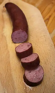 Schüblig are various heavily smoked sausages made throughout the German-speaking part of Switzerland as well as the Black Forest and Lake Constance areas of southern Germany. Made of pork[2] or beef, some schüblig are classified as dry sausage, while others are cooked smoked sausage. In Eastern Switzerland, Häsch Schüblig i de Ore? (have you got schüblig in your ears?) is a common saying when someone misunderstands and can't make out what is being said.[3]