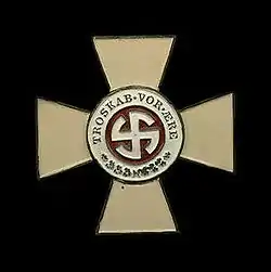 Enlisted men wore a cross painted in off-white color with golden outer edges. The cross has a medallion in the center, which is soldered to the cross. The medallion has the golden inscription Our Honour is Loyalty (Danish: Troskab er Vor Ære) and golden oak leaves below. In the inner ring is a white mobile swastika with an opaque red paint in the background.