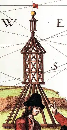 The Scharhörnbake was the most important daymark on the German North Sea coast for several centuries. First erected in 1661 by the City of Hamburg on the sandbank Scharhörn and south side of the Elbe estuary, it was rebuilt over centuries and taken down finally in 1979. Equipped with a room, it also functioned as a refuge beacon for shipwreck survivors from 1840 to 1965.[1][2][3] The only remaining element today is the boulder stone foundation near Nigehörn.