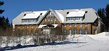 In 1869, the stage manager of the municipal theater in Freiburg built and ran a cottage to the south-west of the peak. After various changes, the guest house "Zur Friedrichsruhe" emerged, also known as "Berghotel Schauinsland" (mountain hotel Schauinsland). After a fire in 1926, the house was reconstructed to its current form. From 1936 to 1982, Heinrich Sauerer ran the mountain hotel together with his family. Afterwards, the workers' welfare union ran the guesthouse as a conference and meeting place for groups for thirteen years. As of 2006, the house, including 50 beds, can be fully rented. It is also the location of a detective novel.[2]