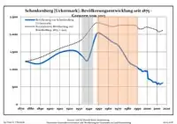 Development of population since 1875 within the current boundaries (Blue line: Population; Dotted line: Comparison to population development of Brandenburg state; Grey background: Time of Nazi rule; Red background: Time of communist rule)