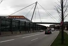 The tram crosses the Schenkendorfstraße on the Schenkendorf bridge, an 84-meter long cable suspended bridge with a pylon, which also allows pedestrians and cyclists to cross the road. First, the foundations and the mast were created. On 5 July 2008, and on 6 July 2008, the pre-fabricated bridge elements were put into place. The construction costs of the bridge amounted to € 7.2 million.[2]