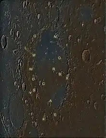 By convention these features are identified on lunar maps by placing the letter on the side of the crater midpoint that is closest to Schickard.