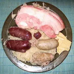 A Schlachteplatte, Schlachtplatte, Schlachtschüssel (Southern German) or Metzgete (Swiss and southwestern part of Baden-Württemberg in Germany) is a hearty German dish[1] that primarily consists of boiled pork belly (Kesselfleisch) and freshly cooked Blutwurst and Leberwurst sausages. The cooking process produces sausage juices which, together with any split sausages, are used as a soup known as Metzelsuppe. As a result, in many places, e.g. in parts of the Palatinate, the entire festival and the meal in particular are known as Metzelsupp.
