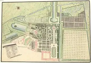In 1720, Josep Charles (1694-1729), hereditary prince of Sulzbach constructed a summer palace in Oggersheim.[1][2][3] In 1729, a baroque Loreto chapel was added in the palace gardens.[3] When prince Joseph Charles passed away in 1729, the palace was not used for 22 years until 1752, when Count palatine Frederick Michael of Zweibrücken-Birkenfeld (1724-1767) turned Oggersheim into his summer residence.[1][2] With help of the architect Nicolas de Pigage (1723-1796), he fully reconstructed the palace between 1752 and 1757.[1][2] In addition, a large baroque garden in French style was created, including various pavilions, bath houses as well as a large orangery.[1][2][3]