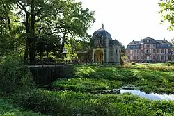 Schloss Türnich was built from 1757 to 1766 as a Baroque schloss, probably designed by Michael Leveilly, then the French court architect of the Electorate of Cologne.[1] It was augmented in the 1790s by an English landscape garden.[2] The Hoensbroech family acquired the property in 1850[3] and expanded Schloss and garden by a gatehouse.[1] A chapel was built next to the palace in 1893.[3]