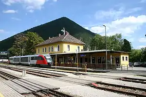 The Schneeberg Railway (German: Schneebergbahn) is a local railway line in Lower Austria running from Wiener Neustadt to the Hochschneeberg mountain. From Wiener Neustadt to Puchberg am Schneeberg it runs as a standard gauge, adhesion railway (main section) and from Puchberg am Schneeberg to the Hochschneeberg as a narrow-gauge, cog railway (extension).[1] The main section from Wiener Neustadt to Puchberg am Schneeberg had a branch to Wöllersdorf from the outset. The section built later from Sollenau to Feuerwerksanstalt (extension) is now closed and renaturalised.