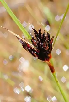 Schoenus apogon, known as common bog-rush, is a species of sedge native to eastern Australia, New Zealand and Japan. A tufted annual grass-like plant growing to 55 cm tall. Often seen in seasonally wet habitats. A species of variable form, which may include more than one taxon. The specific epithet apogon is derived from Greek, meaning "no beard".[1][2]