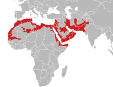 Northwest India, Afghanistan (Leviton 1959: 461), Pakistan, south Turkmenistan, Western Sahara, Tunisia, Morocco, Algeria, Libya, Egypt, Jordan, Palestine, Israel, Mali, Mauritania, Nigeria, Sudan, Ethiopia, Eritrea, Somalia, Saudi Arabia, United Arab Emirates, Oman,[3] Syria, Iraq, Iran (Kavir Desert), and Yemen.