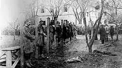 Following Austria-Hungary's declaration of war against Serbia on 28 July 1914, the Schutzkorps began conducting mass executions of Serb civilians in Herzegovina, notably hanging 79 of Trebinje's most prominent Serb citizens, among them intellectuals, landowners, and members of the clergy.[26] Killings continued throughout Herzegovina, accompanied by the taking of hostages, looting, and the destruction of property.[27] Executions were often arbitrary and the majority of victims were denied the right to legal recourse.[17] Along the Drina River, near the border with Serbia, the Schutzkorps were tasked with "anti-bandit operations", culminating in a massacre of Serb civilians near Foča.[24]