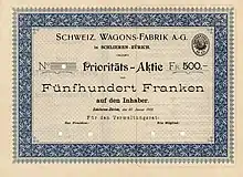 Share of the Schweizerische Wagons-Fabrik AG, issued 20. January 1902