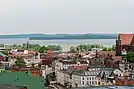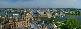 Schwerin on Lake Schwerin (Schweriner See), subdivided into Outer Lake (Außensee) and Inner Lake (Innensee) by Paul's Dam (Paulsdamm).