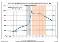 Development of population since 1875 within the current boundaries (Blue line: Population; Dotted line: Comparison to population development of Brandenburg state; Grey background: Time of Nazi rule; Red background: Time of communist rule)