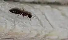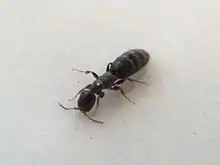 Males have wings but lack a stinger. Females are 2–5 mm long; they have a stinger but lack wings. They are black/brown, and have the appearance of ants. Females enter woodworm holes, paralyze the woodworm larvae with the venom of the stinger and lay their eggs in the corpses, which form the food for the S. domesticus larvae. This behavior leads to the common name of "antiquarian's friend".