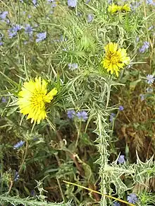 Scolymus maculatus is a spiny annual plant in the family Asteraceae, native to the Mediterranean region in southern Europe, southwest Asia, and northern Africa, and also the Canary Islands. It has pinnately incised prickly leaves and prickly wings along the stems, both with a white marginal vein. The yellow flowerheads stand solitary or with a few together at the tip to the stems, and subtended by more than five leaflike bracts. The plant is known as scolyme taché in French, cardogna macchiata in Italian, cardo borriquero in Spanish, and escólimo-malhado in Portuguese, חוח עקוד in Hebrew and سنارية حولية in Arabic. In English it is called spotted golden thistle or spotted oyster thistle.[1][2]