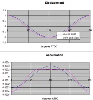 Comparison of displacement and acceleration for a Scotch yoke compared with a crank and slider