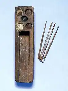 Ancient Egyptian scribe's palette with five depressions for pigments and four styli