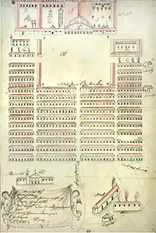 In the region submitted to the Jesuit Province of Paraguay, which included the Misiones Orientales, and which many consider having set the "classic" prototype of the Jesuit settlement, this settlement was defined around a large square, where there was a church, Indian residences, houses for widows and orphans, a school, the missionaries' cloister, a cemetery, several workshops and small industries that supplied basic needs, an orchard, a vegetable garden, administrative spaces, an inn, a prison, among other improvements. On semi-autonomous farms nearby, there were black slaves, the cultivation of crops, and the raising of cattle. They bartered their products with various Spanish colonies and Europe. Sometimes the surroundings of the urbanized nucleus were protected with trenches and a wall to defend against the attacks of wild Indians and the predatory expeditions of the Brazilian bandeirantes, which occurred many times.[9][10][11][12] Therefore, some missions, by special license from the Spanish Crown, had small armies and cavalry.[13] The government of civil affairs and elementary education were generally handed over to the Indians and respected tribal hierarchies. Advanced education-including the direction of arts, engineering, and architecture, the divine offices, catechesis, and justice, as well as general supervision of all affairs, were left to the Jesuits.[14]