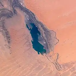 Sebkha el Melah is a salt lake that has formed in a basin in Béni Abbès Province in southwestern Algeria, to the south of the Atlas Mountains. The rocky ridge of the Ougarta Range lies to the west and the sand dunes of the Grand Erg Occidental to the east.[2] Sebkha itself has an annual precipitation of about 20 mm (0.8 in), which is much less than the Saharan Atlas to the north (150 mm (6 in)). The lake is fed by the seasonal river Oued Saoura but most of the year the volume of water evaporated from the surface exceeds the volume of water flowing in, and a salt crust is formed. The basin has no outflow, and because the source of the water is continental rather than marine, the amount of salt deposited is limited.[3]