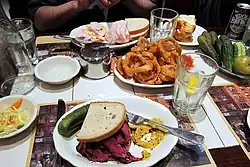 The delicatessen's specialties include matzoh-ball soup, corned beef, pastrami, knishes, gefilte fish, cholent and other notables of Jewish cuisine. Despite the deli being under kosher supervision,[12] most Orthodox Jews will not eat there because the restaurant is open on Shabbat. The restaurant is certified by the International Kosher Council and all meat is kosher but not all is glatt kosher. Pareve items are prepared on meat equipment.[13]