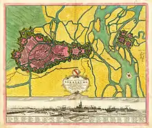 The Kehl garrison consisted of one battalion of the 24th Demi-brigade and some detachments of the 104th under command of Balthazar Alexis Henri Schauenburg. This was too weak a force to defend a position of such importance, or to develop additional extensive works. Moreau reported that some of Scherb's troops had arrived, but it is unclear which ones. Furthermore, the lack of cooperation from local peasant workers and the exhaustion of troops prevented the enhancements of the fortifications from proceeding with any speed.[13] On the evening of 16 September, Petrasch and most of his column had arrived at Bischofsheim, immediately by Kehl, with three battalions and two squadrons; more troops were not far behind.[14] By 17 September, a small corps of Austrians approached the outskirts of Kehl and vigorously attacked the French sentries there; this was merely a prelude to the more significant action the following day.[13]