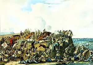 Inferior in numbers and lacking artillery support, the inexperienced units were pushed back and began to flee in disorder.[44] Seeing the Landwehr battalion's success, the other Austrian battalions began to pursue the Hungarians; as they approached to 1.5 km (0.93 mi) from the Hungarian fortified encampment, its 12- and 24-pounder cannons had an effect. This did not stop the Reischach brigade, which continued pursuing the Hungarians as Reischach responded to the cannons with rockets.[45] Although Haynau forbade him to attack Komárom's trenches and defensive works, Reischahch did not halt his brigade; he ordered the two battalions of jägers, the first battalion of the Parma infantry regiment and the Landwehr battalion to lead the attack.[46]