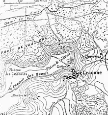 During the German withdrawal to the Siegfriedstellung (Hindenburg Line) in March 1917, a modest withdrawal took place in the neighbourhood of Soissons. On 17 March, the German defences at Crouy and Côte 132 were found to be empty and as French troops followed up the retirement, German troops counter-attacked at Vregny and Margival, which reduced the speed of the French pursuit to a step-by-step advance. By April, the French advance had only progressed beyond Neuville-sur-Margival and Leuilly. On 1 April, a French attack along the line of the Ailette–Laon road reached the outskirts of Laffaux and Vauxaillon. Vauxeny and Vauxaillon were occupied a few days later.[10]
